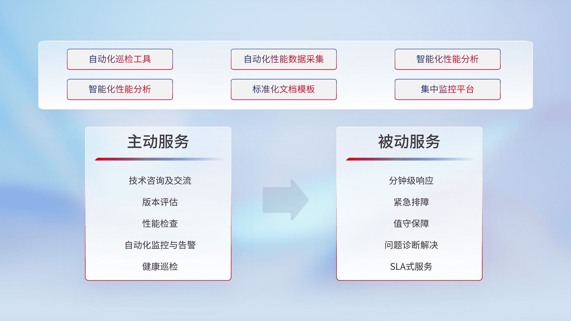 智能化工具和标准化文档,,,保障服务质量,,,提供主动服务(包含技术咨询、、版本评估、、性能检查、、自动化监控与告警、、健康巡检)和被动服务包含(分钟级响应、、、紧急排障、、值守保障、、、问题诊断解决、、、、SLA服务)。。。