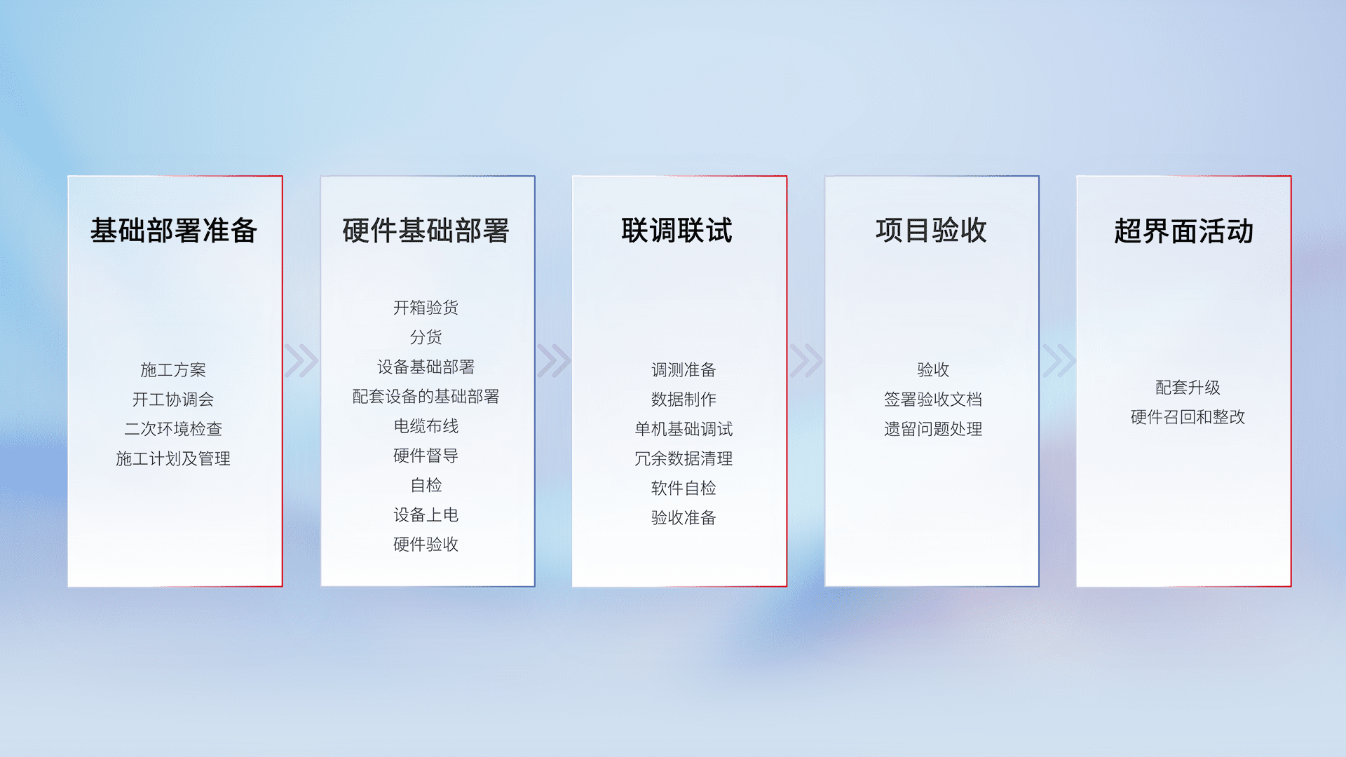 从基础部署准备、、、硬件基础部署、、、联调联试、、项目验收、、、、越界面活动的全过程可追溯,,,保证施工质量和进度。。。。
